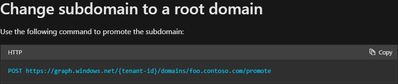 # Invoke-RestMethod -Method Post -Headers @{Authorization="Bearer $($AadToken)"; "Content-Type"="application/json"} -Uri 'https://graph.windows.net/{your Tenant GUID goes here}/domains/{your child domain name goes here}/promote?api-version=1.6'