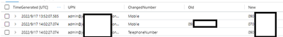 AuditLogs | where OperationName == "Update user" | where TargetResources contains "Mobile" or TargetResources contains "TelephoneNumber" | mv-expand TargetResources | extend Changes = parse_json(TargetResources.modifiedProperties) | mv-expand Changes | where Changes.displayName in ("Mobile","TelephoneNumber") | project TimeGenerated, UPN = TargetResources.userPrincipalName, ChangedNumber = Changes.displayName, Old = parse_json(tostring(Changes.oldValue))[0], New = parse_json(tostring(Changes.newValue))[0] | sort by TimeGenerated ascOutput Image: