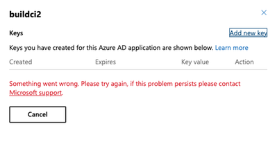 I have been running into exactly the same issue while trying to set up automated signing following https://docs.microsoft.com/en-us/windows-hardware/drivers/dashboard/dashboard-api. When trying to add a new key for my Azure AD application, the UI just says "Something went wrong" with a generic HTTP 400 response.