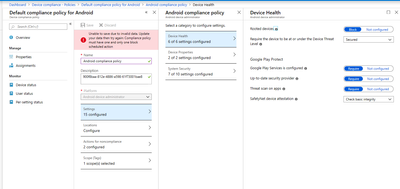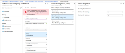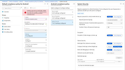 I am trying to setup new compliance policies for my mobile devices but I have issues. For example when I try to modify default Android compliance policy I am getting following error.
