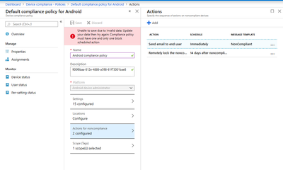 Unable to save due to invalid data. Update your data then try again: Compliance policy must have one and only one block scheduled action
