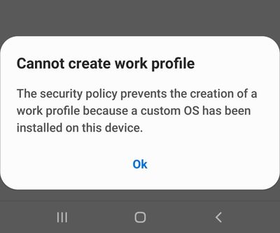 - fajarslatifCopper ContributorI am having the same issue. My Samsung Note9 has triggered knox (previously rooted). But at the moment it is running stock room with the latest update and security patch installed. It is still giving me the error "the security policy prevents the creation of a work profile because a custom OS has been installed on this device"