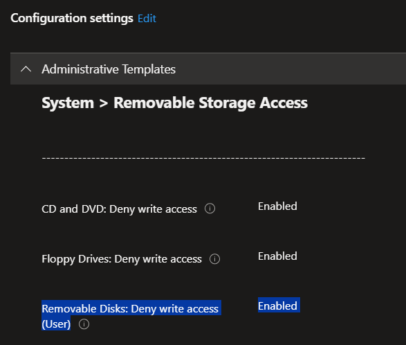 Configuration settings>Administrative Templates>Custom Classes: Deny write access (User): Enabled