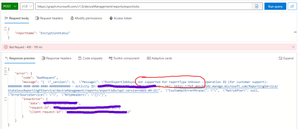 I am trying to use Graph deviceManagement reports API to query the Intune https://learn.microsoft.com/en-us/mem/intune/protect/encryption-monitor#report-details but i get error "PostExportJobAsync no...