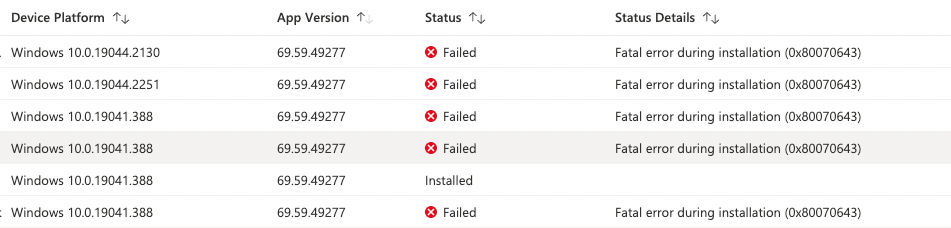 - That error just means: Fatal error during installation.... So without any logs from the IME or msi verbose logging its hard to tell why its failing.. How are you deploying it? MSI/Win32app package with proper detection rules? Start by logging in to a problem device and try to initialize the installation from the cp (mark it as available) and watch the IME and the event logs...
