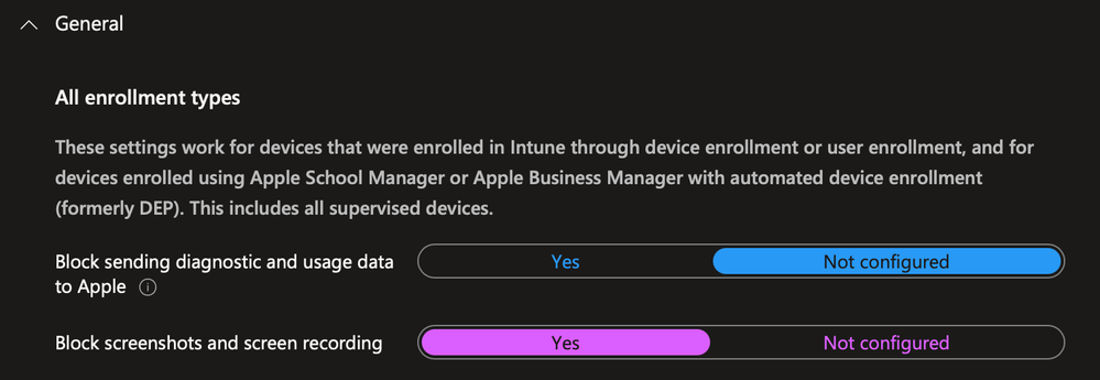 Finally, this option has been arrived. For apps that have updated to v19.7.6 or later for Xcode 15 and v20.2.1 or later for Xcode 16 of the SDK, screen capture block will be applied if you have configured Send Org data to other apps setting to a value other than “All apps”. You can configure app configuration policy setting “com.microsoft.intune.mam.screencapturecontrol = Disabled” if you wish to allow screen capture for your iOS devices.