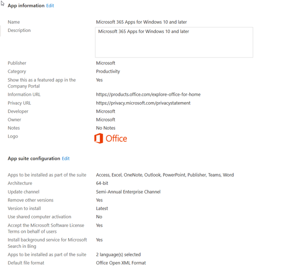 Hello, adding to all the things that Yasemin​ already mentioned, might I suggest considering a different deployment method for your office suite? I believe you are using the built-in method provided by Intune, but Deploying Office through Win32 usually makes more sense because you can configure your desired suite through the Office Customization Tool: https://config.office.com/deploymentsettings and then use the office deployment tool with the generated xml to tune the installation to meet your needs: https://www.microsoft.com/en-us/download/details.aspx?id=49117.