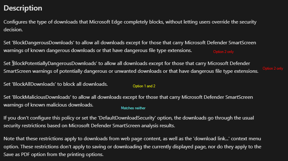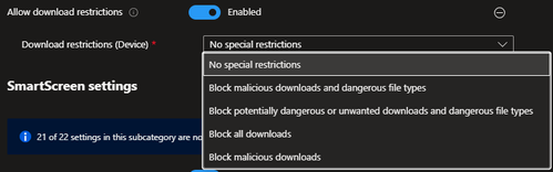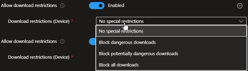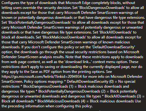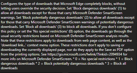Only one configuration in the Edge documentation (https://learn.microsoft.com/en-us/deployedge/microsoft-edge-policies#downloadrestrictions)
