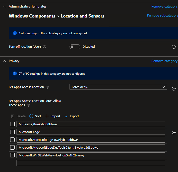 I manage the pcs with intune and if i open the location to everything it's working but when i keep only Microsoft Edge in the one to have access to my location it stop working, what im doing wrong???