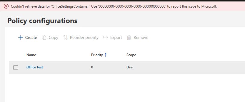Title: Admins may see an error when accessing the Cloud Policies page in the Microsoft Intune admin center User impact: Admins may see an error when accessing the Cloud Policies page in the Microsoft Intune admin center. More info: Users receive an error message that states, "Couldn't retrieve data for 'OfficeSettingsContainer'. Use '00000000-0000-0000-0000-000000000000' to report this issue to Microsoft." The error doesn’t prevent admins from accessing the page and they can still leverage all the functions on the Cloud Policies page as expected. Current status: Our review of the previously mentioned HAR logs has helped us isolate a potential change in how the Microsoft Intune Iframe for Microsoft 365 applications portion of the Microsoft Endpoint Manager admin center page is calling the Cloud policies. We're analyzing this suspected change to determine if it's the culprit behind the impact and to develop a strategy for remediating the issue. Scope of impact: Any admin attempting to access the Cloud Policies page in the Microsoft Intune admin center is impacted. Next update by: Thursday, March 6, 2025, at 7:00 PM UTC