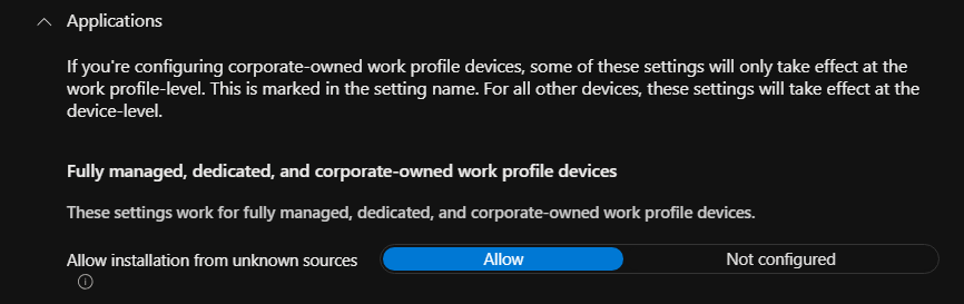 I you are using Android Enterprise you are unable to deploy apps as inhouse LOB app, see for example this discussion: https://www.reddit.com/r/Intune/comments/1abfbdy/deploying_inhouse_apk_to_android_devices/ You need to follow the following procedure: https://learn.microsoft.com/en-us/mem/intune/apps/apps-add-android-for-work#managed-google-play-private-lob-apps