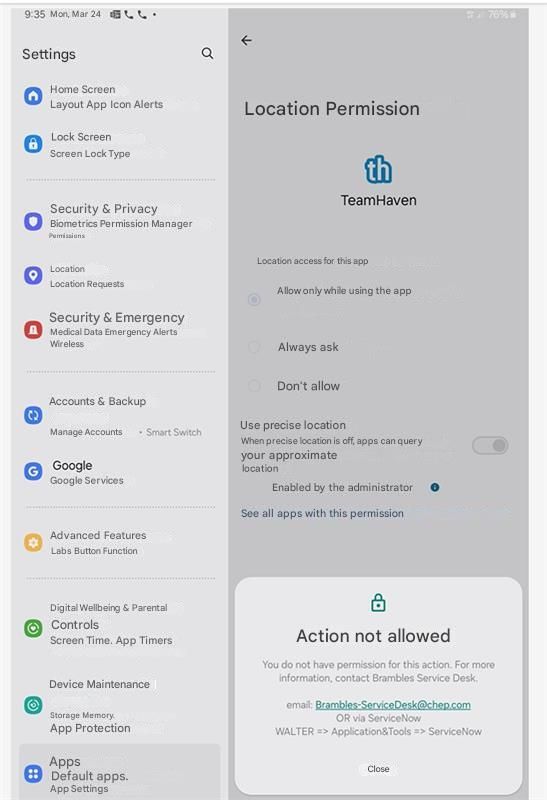 One user is using a App in their company owned Android device. However, user is unable to get access to google maps and location permission is stating Action not allowed. How to resolve this?