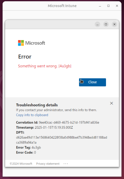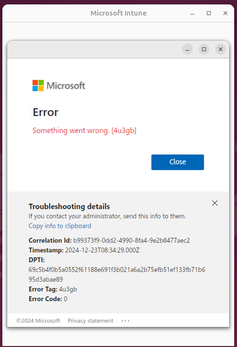 Even though it's a manual process, could you show me how you managed to complete the registration? Would it be possible to share a step-by-step guide? I haven’t been able to register the application despite multiple attempts. I noticed the issue only occurs when using Entra-ID, resulting in the code [4u3gb] in the Intune Portal. At the company, I want to use Linux, so solving this step would be a significant breakthrough.If I test with a local machine user, without using authd (Entra-ID), and use the local user with the Intune Portal, it allows me to register the application. So, I’d like to know how you managed to do it.