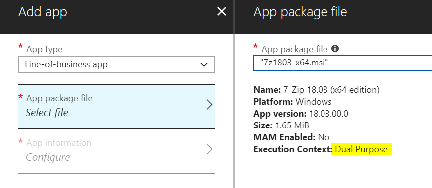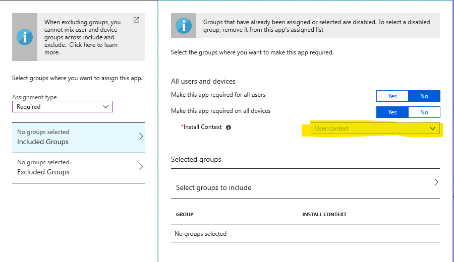 Unsuccessful in my attempts to deploy an MSI via Intune. I want to target the device context for deployment, but the drop-down to select this option is disabled in the Intune assignment GUI. There is a caveat about device context installs not being available to Windows 10 prior to 17134.81/May 2018 release, but that doesn't apply here, since the devices I'm attempting to assign are past that build. Any ideas?