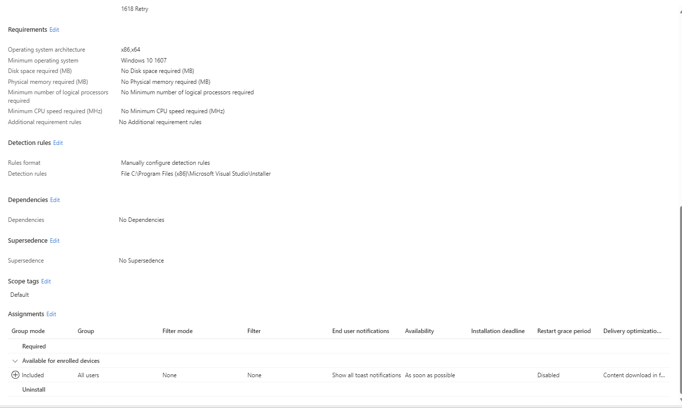 AppActionProcessor - Sep 26, 2023It looks okay and is the same as my settings... If Visual Studio is installed, you have C:\Program Files (x86)\Microsoft Visual Studio\Installer\vs_installer.exe on the drive. Intune would have given an alert about that if not...