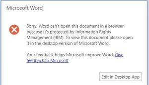 Whenever I try to open a file that has been protected by AIP via my web browser I get the below message Even as a creator of this document, I am prevented from editing the document via the web...