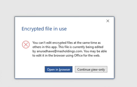 Hi All, I am trying to open an encrypted document while someone is opening a document and below error message is shown up. However, I have already enabled the Co-Authoring in my tenant but there ...