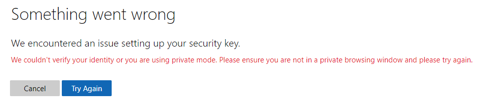 ERROR: "We couldn't verify your identity or you are using private mode. Please ensure you are not in a private browsing window and please try again."