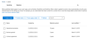 Due to customer feedback, we have removed this feature that creates the default retention labels and retention label policy mentioned above. You will only see these retention labels and retention label policy if you opened file plan manager before April 11, 2019.