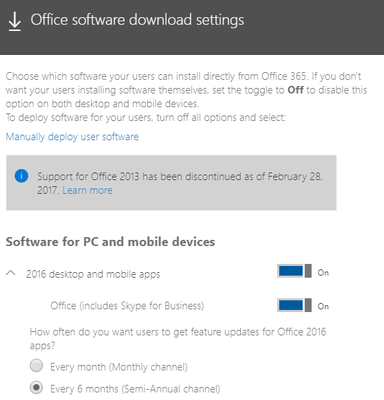 Under "How often do you want users to get feature updates for Office 2016 apps?", our tenant has "Every 6 months (Semi Annual Channel). But when I downloaded from the portal, I was able to get the Monthly Channel 1805 version of Office. Again - I'm already setup for Monthly Channel but we have been having issues with SCCM distribution of the Monthly updates so I was testing some other ways to get the latest version.