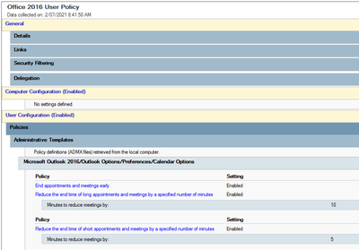 The new version of office changed the name from ending meetings and appointment early to shorten meetings and appointments. Therefore the registry key has changed. If u wanna go with the local gpo then update the admx