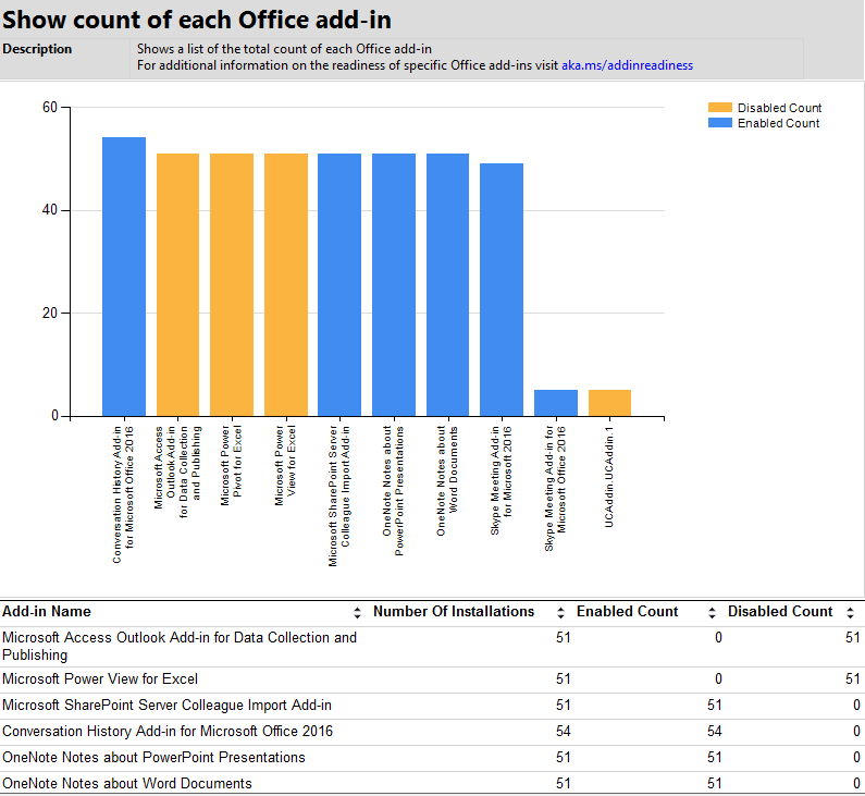 This report gathers the inventory of each Office add-in that is installed as well as the device that has it installed and the status (enabled, disabled) allowing you to determine which add-ins are in use as well as the impact based on the number of installations. This report also provides a link to Microsoft's Office ProPlus Add-in Readiness report which you can view from http://aka.ms/addinreadiness.
