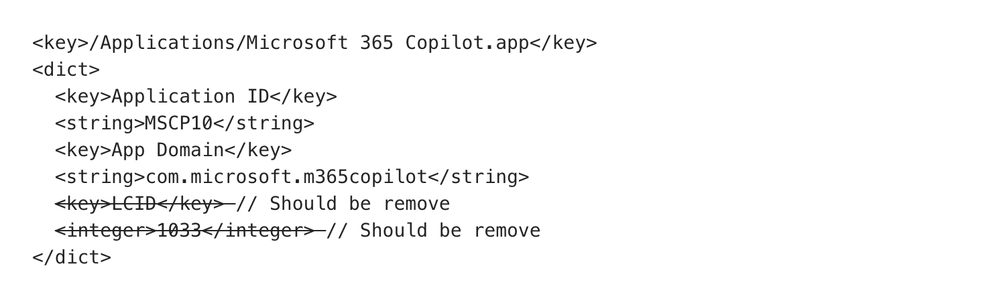 Please note that the app may not function as expected if MAU configurations are being managed through MDM. To mitigate, tenant administrators can remove the LCID key from their MAU configuration, as illustrated below.