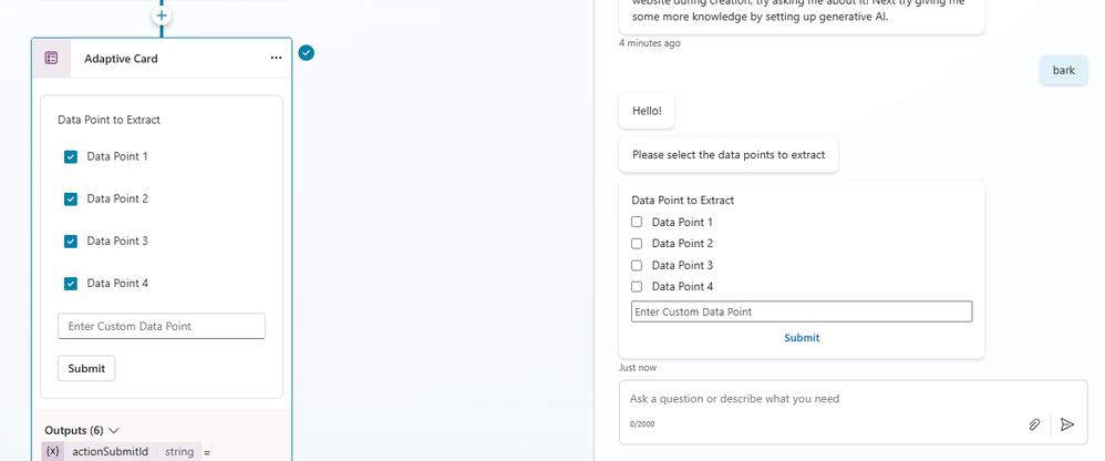 { "type": "AdaptiveCard", "$schema": "https://adaptivecards.io/schemas/adaptive-card.json", "version": "1.5", "body": [ { "type": "TextBlock", "text": "Data Point to Extract", "wrap": true }, { "type": "ColumnSet", "columns": [ { "type": "Column", "width": "stretch", "items": [ { "type": "Input.Toggle", "title": "Data Point 1", "value": "true", "id": "dataPoint1" }, { "type": "Input.Toggle", "title": "Data Point 2", "value": "true", "id": "dataPoint2" }, { "type": "Input.Toggle", "title": "Data Point 3", "value": "true", "id": "dataPoint3" }, { "type": "Input.Toggle", "title": "Data Point 4", "value": "true", "id": "lenderResp" }, { "type": "Input.Text", "placeholder": "Enter Custom Data Point", "id": "customText" } ] } ] }, { "type": "ActionSet", "actions": [ { "type": "Action.Submit", "title": "Submit" } ] } ] }Key Fixes: