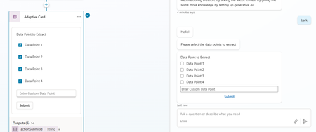 Hello! I am building a custom Copilot agent that analyzes documents for specific data points. Goal Have an Adaptive Card display the list of pre-defined data points and allow the user to ...