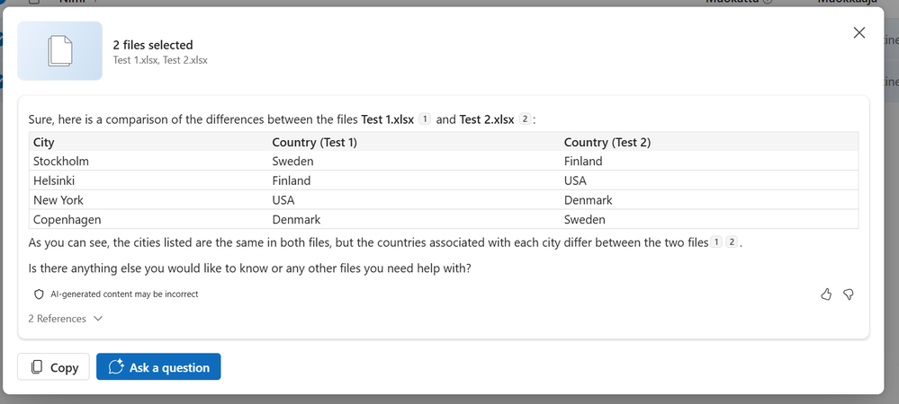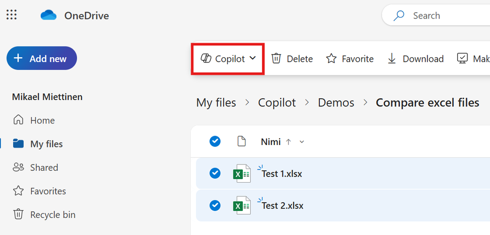 leonoehlinger​, as shown in the screen shot above, please confirm that you're viewing your files under the My Files tab. Within that space is where Copilot will appear and support file comparisons. If you are within My Files and still don't see Copilot, please share a screenshot so we can take see what you're describing.