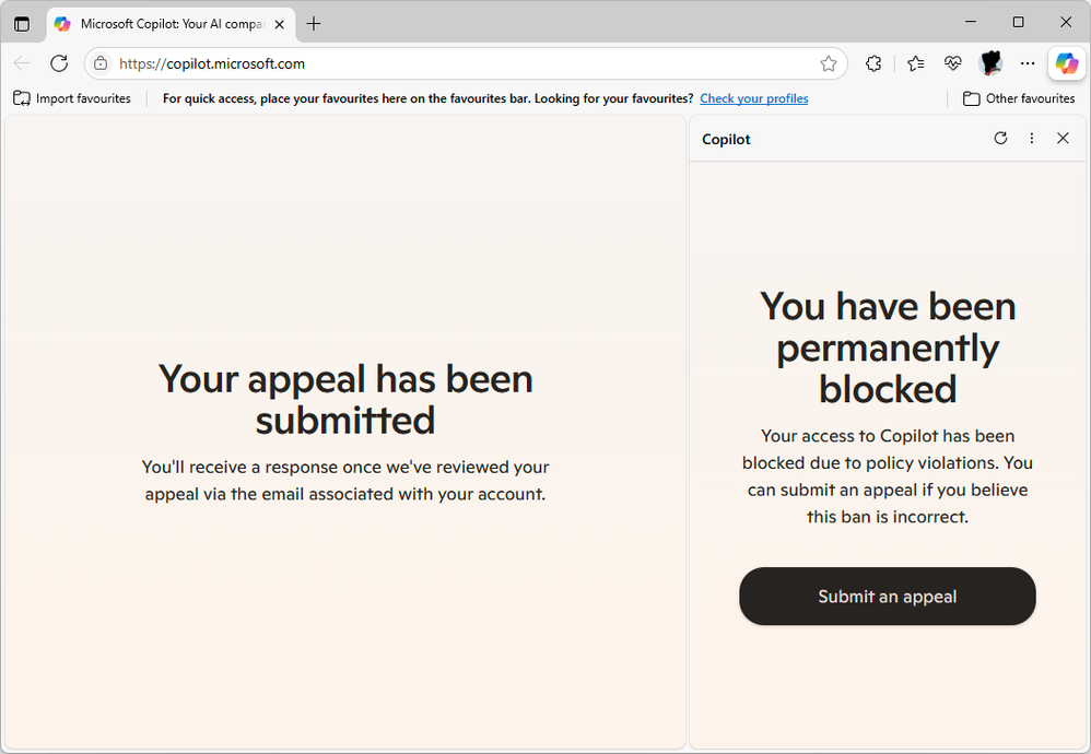 My Copilot account was banned around March 2025, without any warning or explanation. I have submitted multiple appeals via the official https://copilot.microsoft.com site, but have not received any confirmation or reply.