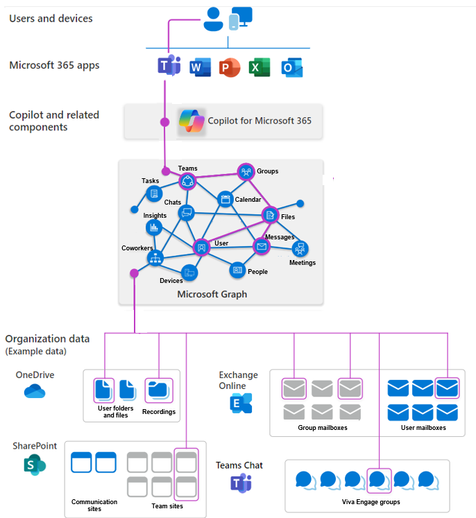 - Copilot for Microsoft 365 applies Microsoft Graph to synthesize and search content from multiple sources within your tenant. The Microsoft Graph API brings more context from user signals into the prompt, such as information from emails, chats, documents, and meetings. This information includes data from services like Outlook, OneDrive, SharePoint, Teams, and more.