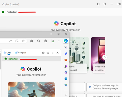 A couple hours later, I opened the Copilot (preview) app in Windows 11, as well as checked out the Copilot Edge Toolbar, and both updated to show "Protected" as well.