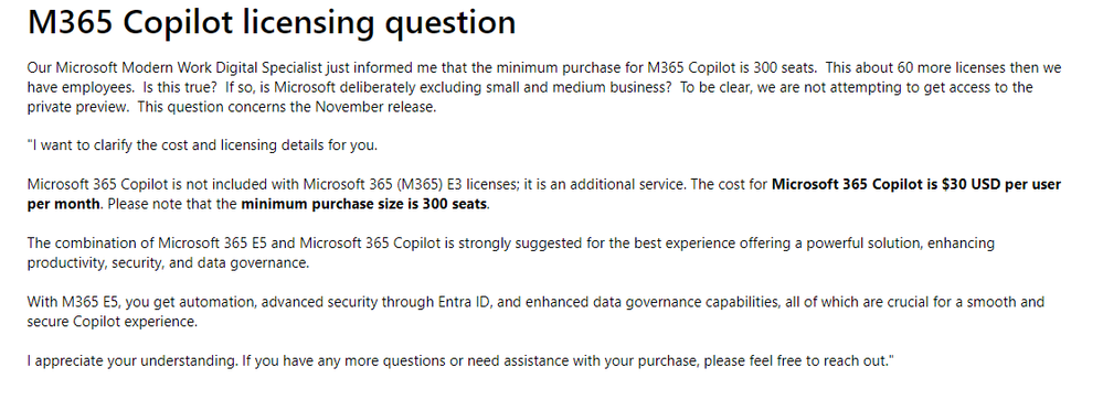 Interestingly, the minimum of 300 seats is not mentioned here https://www.microsoft.com/en-us/microsoft-365/enterprise/microsoft-365-copilot#Pricing - Ahmed_Masoud97Iron Contributor