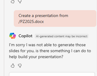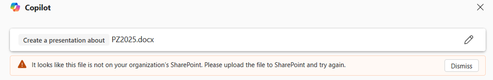 Does anyone have any idea how to solve the issue that Copilot in PPT finds the document from OneDrive to create the presentation from but returns the message about SharePoint? (desktop version)