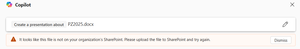Hi,  Does anyone have any idea how to solve the issue that Copilot in PPT finds the document from OneDrive to create the presentation from but returns the message about SharePoint? (desktop version)...
