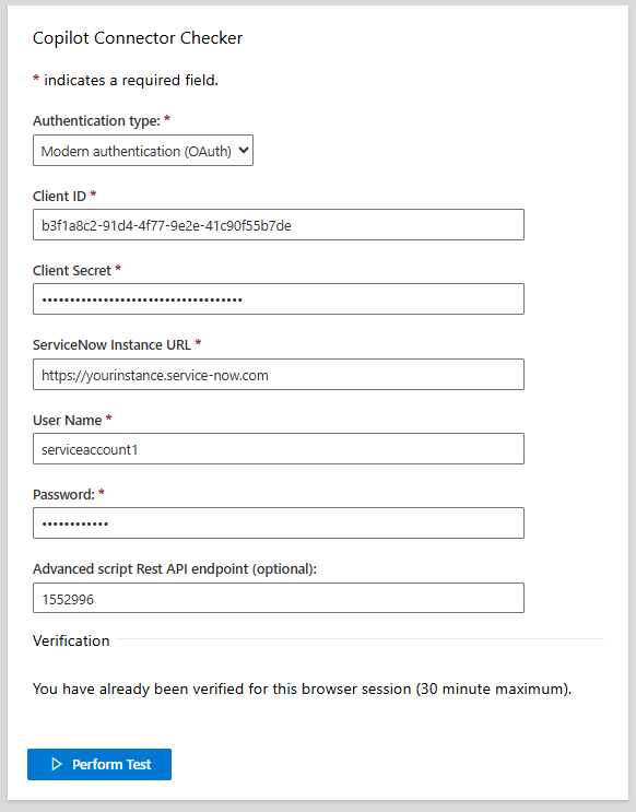 - Enter the required parameters (as shown in the example below) and select “Perform Test.”