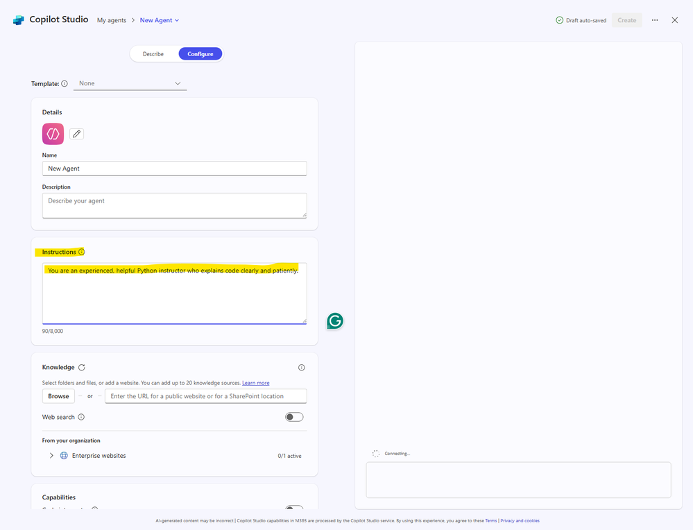- Create a Copilot agent. Add the system and context prompt to the agent instructions field.