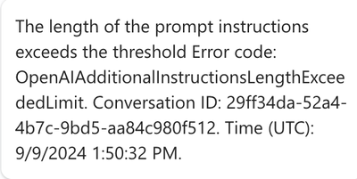 I'm encountering an issue when testing a generative response. Whenever I include a prompt in the input, I receive an error, even though the prompt is under 2000 characters. When I run the test without the prompt, it works fine. Could you please help me understand what might be causing this problem?
