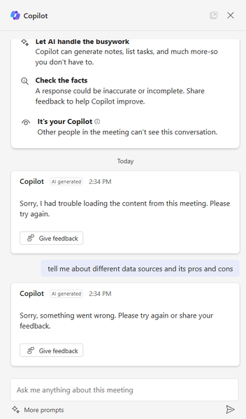 Hello, During the ongoing teams calls ( being recorded) copilot is giving error, and not able to respond. Below is a screenshot. This has been happening for all the calls for a while, and i have ...