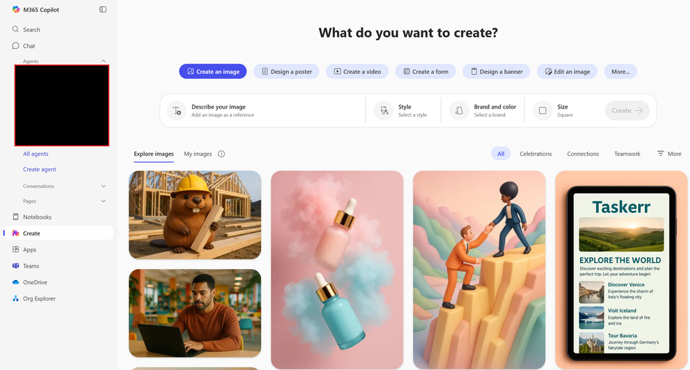 As Microsoft did now announce that Visual Creator will be deprecated, is the new experience "Create" already at your desktop? Just open https://m365.cloud.microsoft/chat and in the lower left Corner you should see the "Create" option. If the new image generation model is already deployed for your Tenant you can create Pictures and Videos directly from there: