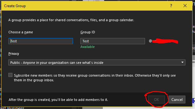 I'm global admin, and am able to create groups via the web interface, however, when I attempt to do the same in Outlook 2016 desktop app (via the ribbon button "New Group") I cannot. The "Create Group" dialog pops open, I supply the information, but the "Ok" button remains disabled. Can anyone confirm this? I'm using Office 2016 first release, if that possibly makes a difference. Perhaps I have some setting/option that's inhibiting creation this way, but I can't figure out what that might be.