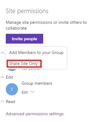 - I shared with contribute permission a modern team site (i.e. connected to a Group) with an external user (not an external member!). For sharing I used the following path: Cog menu -> Site permissions -> Advanced permissions settings -> Grant permissons - Invite.