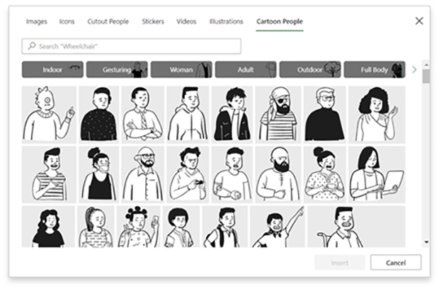 Cartoon People illustrations are a fun way to create artwork and tell stories using a diverse set of characters and scenery. Now, you can put together just about any scene you can imagine, selecting from a huge variety of elements found in the premium content libraries of Word, Outlook, PowerPoint, and Excel.