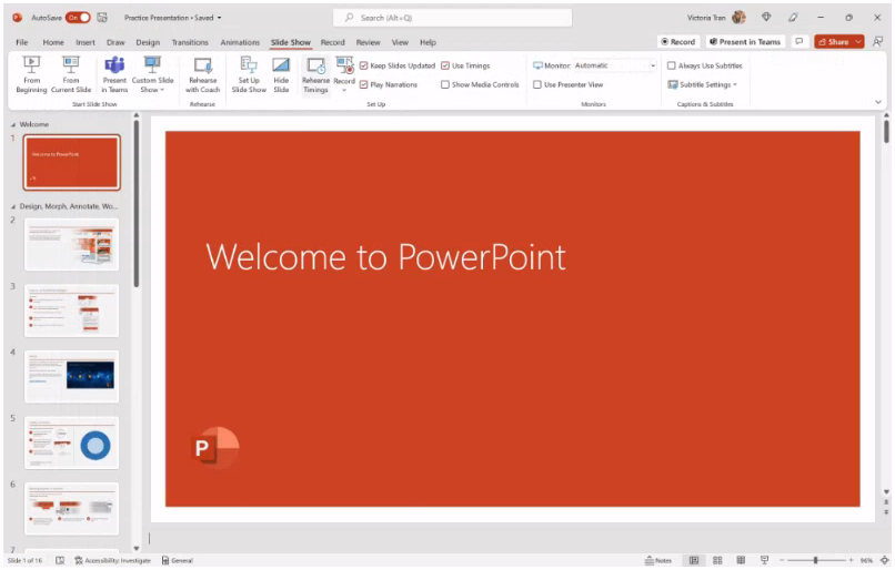 1. To open Presenter view in PowerPoint, click the Slide Show tab and select the Use Presenter View check box.