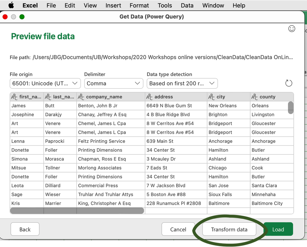- In the Preview file data dialog click the Transform Data button in the lower right corner