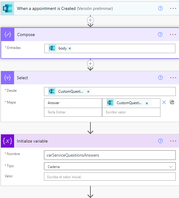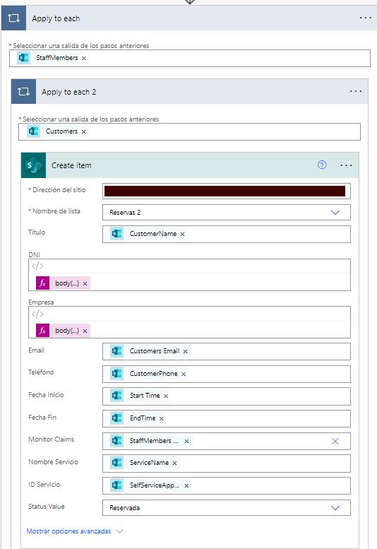 My problem is that it does not copy the personalized responses to the Sharepoint List, it only does so with the first reservation, it does not copy the other reservations. My Bookings service is 1:N, what I want to achieve is to copy the personalized responses to the Sharepoint list.