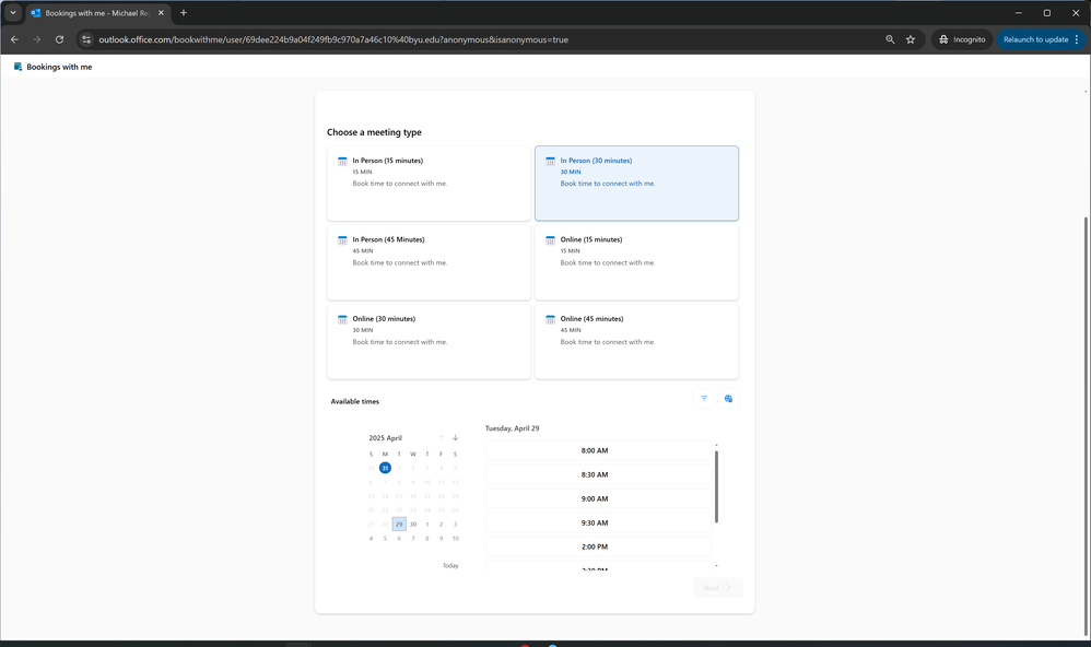 My students come from all over the world. When the register for the university they often set their account timezone as their home timezone. Then they are very confused later when living at the University when their bookings are all off. There is a pretty little timezone icon, but I want a warning or something if their timezone and my timezone are a mismatch. Something, anything to help them to successfully sign up and not be surprised when I tell them they do not have an appointment for the time they "clicked".