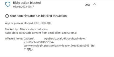 When Outlook requires authentication Defender blocks the log on screen from appearing as the ASR rule "Block executable content from email and client webmail" is blocking .JS files in C:\Users\local_\INetCache\IE<FOLDER>