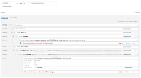 You may want to check the Delivery method, I can see that Firefox has been spawned from Outlook. Could someone have opened a phishing email? It's a common practice to host suspicious files in sharepoint and then point the suspect to a malicious page luring for credentials.